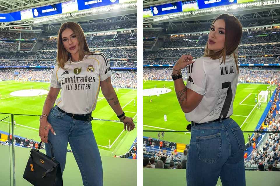 Porto Velho, RO – A influenciadora digital Virginia Fonseca, de 26 anos, esteve no Estádio Santiago Bernabéu, em Madri, neste sábado (4), para assistir à partida entre Real Madrid e Villarreal. Usando a camisa oficial do time espanhol com o nome e o número do atacante brasileiro Vinícius Júnior, de 25 anos, ela acompanhou o jogo das arquibancadas e compartilhou registros nas redes sociais.
