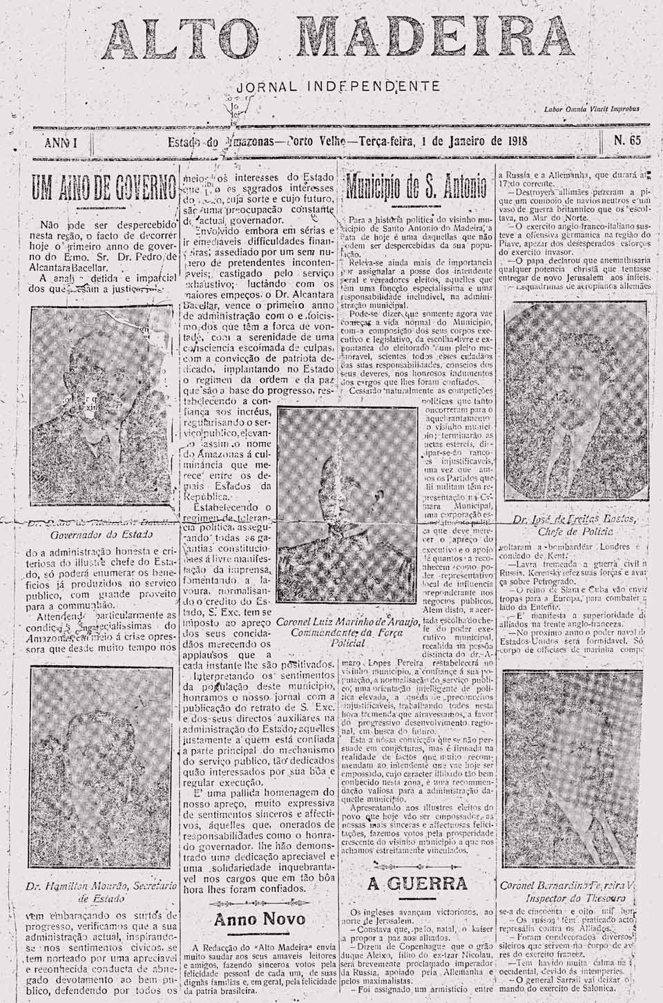 Em 1º de janeiro de 1918, passados 107 anos, a edição nº 65 do jornal Alto Madeira via “tudo azul”, ou seja, o Estado do Amazonas estava bem em sua gigantesca porção que alcançava a margem do Rio Madeira. Ao leitor mais jovem, que ainda não consultou história regional, saiba: Porto Velho tinha uma parte pertencente ao Amazonas. A edição comemorava o “primeiro anno” de governo do Sr. Pedro de Alcântara Bacellar, louvando sua “administração honesta e criteriosa.” Atualizei a grafia.
