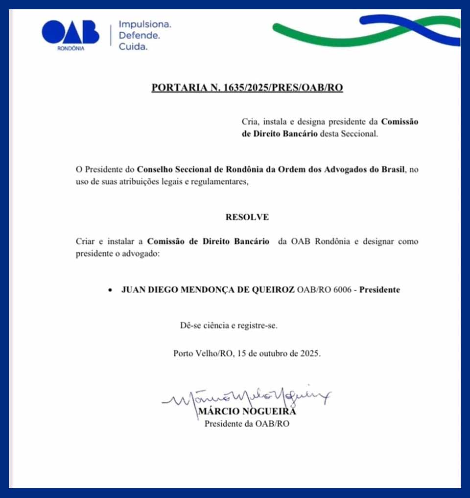 Porto Velho, RO – Formado em Direito pela Faculdade Faro em 2011 e inscrito na Ordem dos Advogados do Brasil desde 2013, o advogado Juan Diego Mendonça de Queiroz foi nomeado presidente da recém-criada Comissão de Direito Bancário da OAB Rondônia. A escolha partiu do presidente da seccional, Márcio Nogueira, e reflete a necessidade de atuação técnica e integrada diante do crescimento das demandas judiciais envolvendo o setor bancário.
