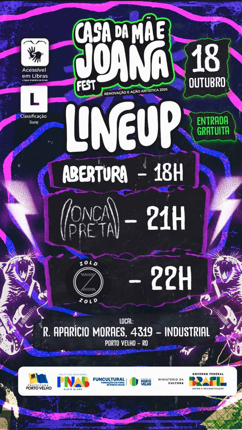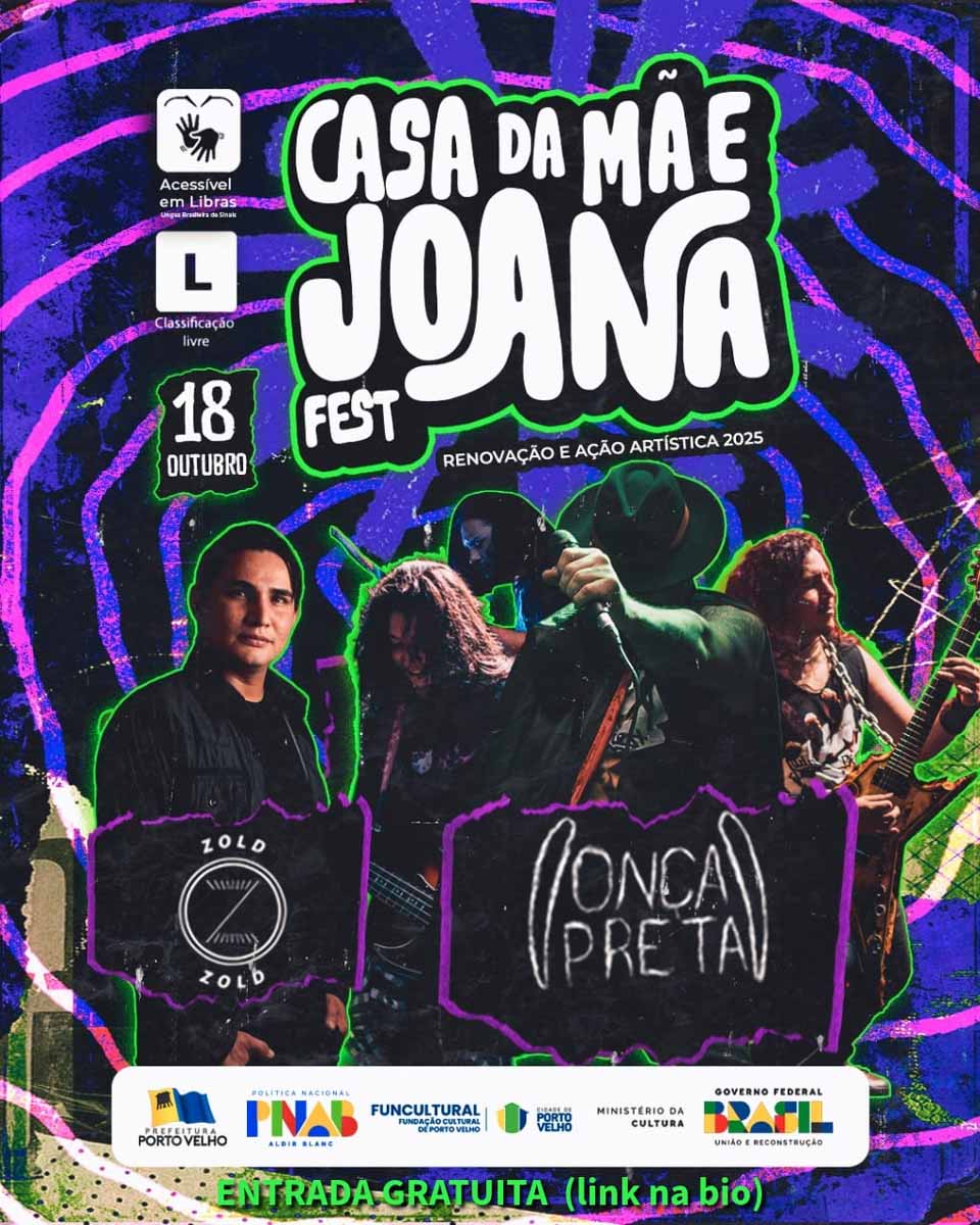 Porto Velho, RO – A Casa da Mãe Joana será palco, no dia 18 de outubro, do evento “Casa da Mãe Joana Fest – Renovação e Ação Artística 2025”, que apresenta uma programação voltada à música autoral e à cena independente de Porto Velho. A entrada é gratuita, mediante retirada de ingressos pela plataforma Sympla.