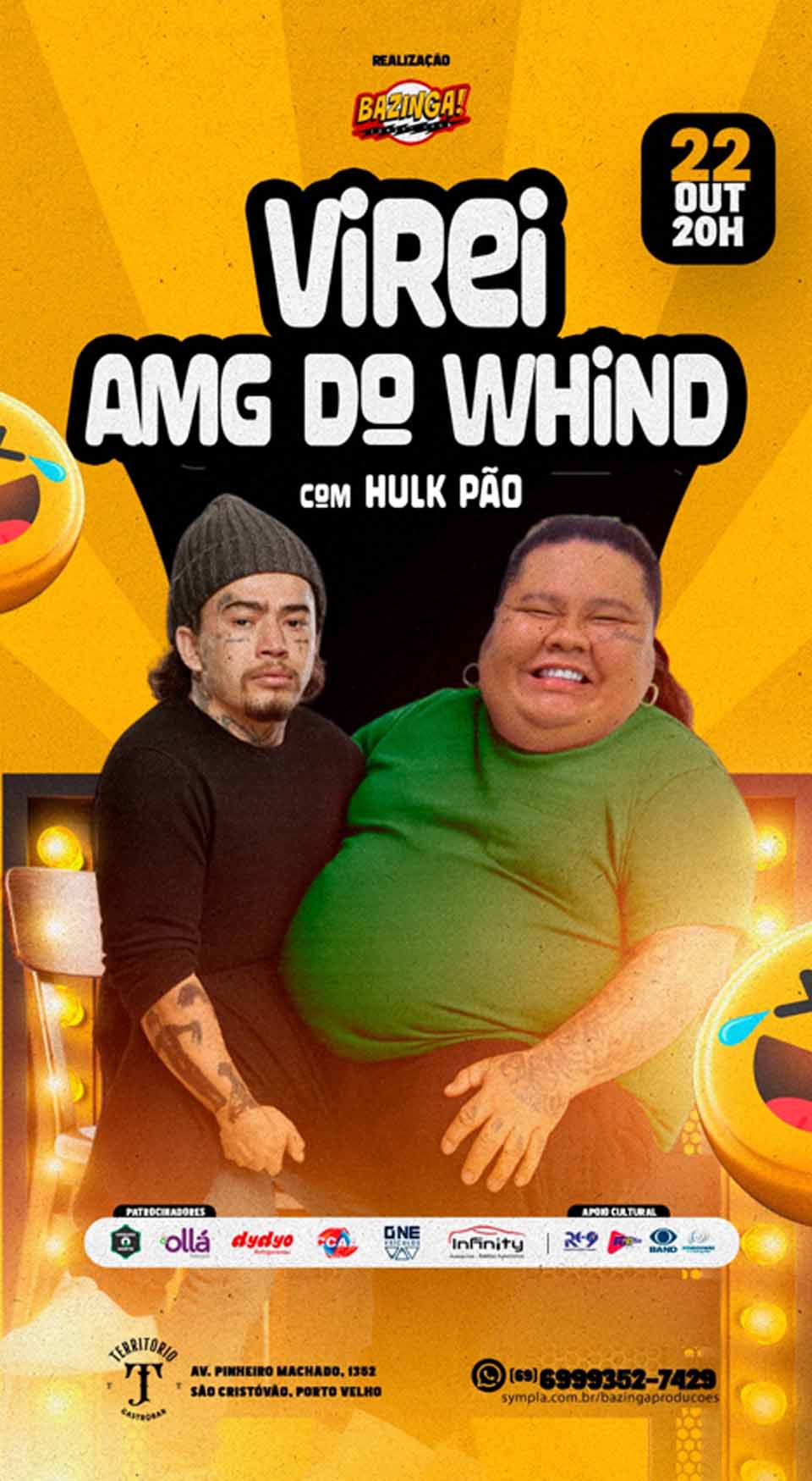 Porto Velho, RO – O público de Porto Velho se prepara para uma noite de risadas com o Bazinga Comedy Show, que traz à capital rondoniense o humorista amapaense Hulk Pão, destaque nacional com o espetáculo “Virei Amg do Whind”. O evento acontece no dia 22 de outubro, às 20h, no Território Gastrobar, localizado na Avenida Pinheiro Machado, nº 1352, bairro São Cristóvão.
