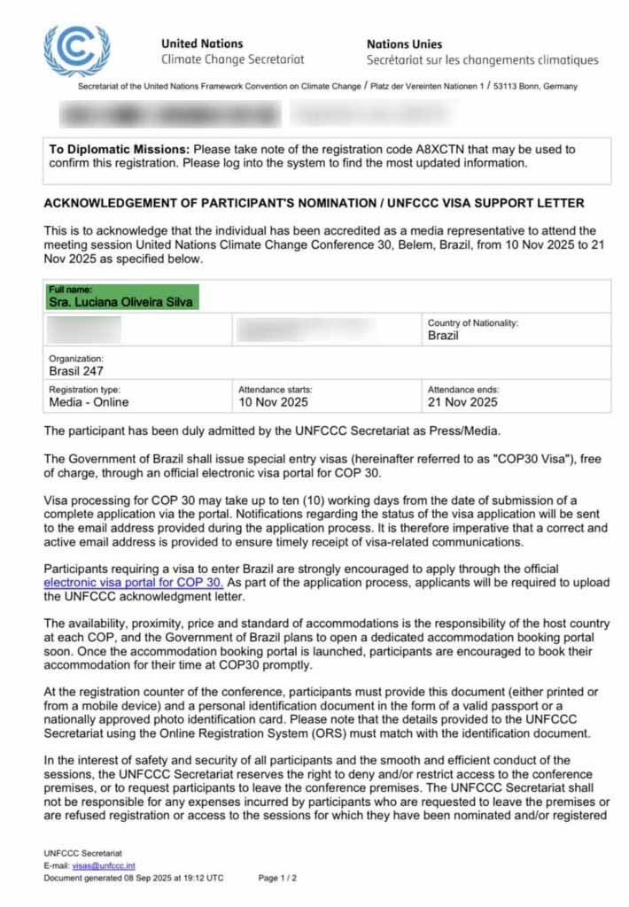 O documento de confirmação de credenciamento, emitido pelo órgão da ONU sediado em Bonn, Alemanha, reconhece Luciana como participante da conferência na categoria “Media – Online”.