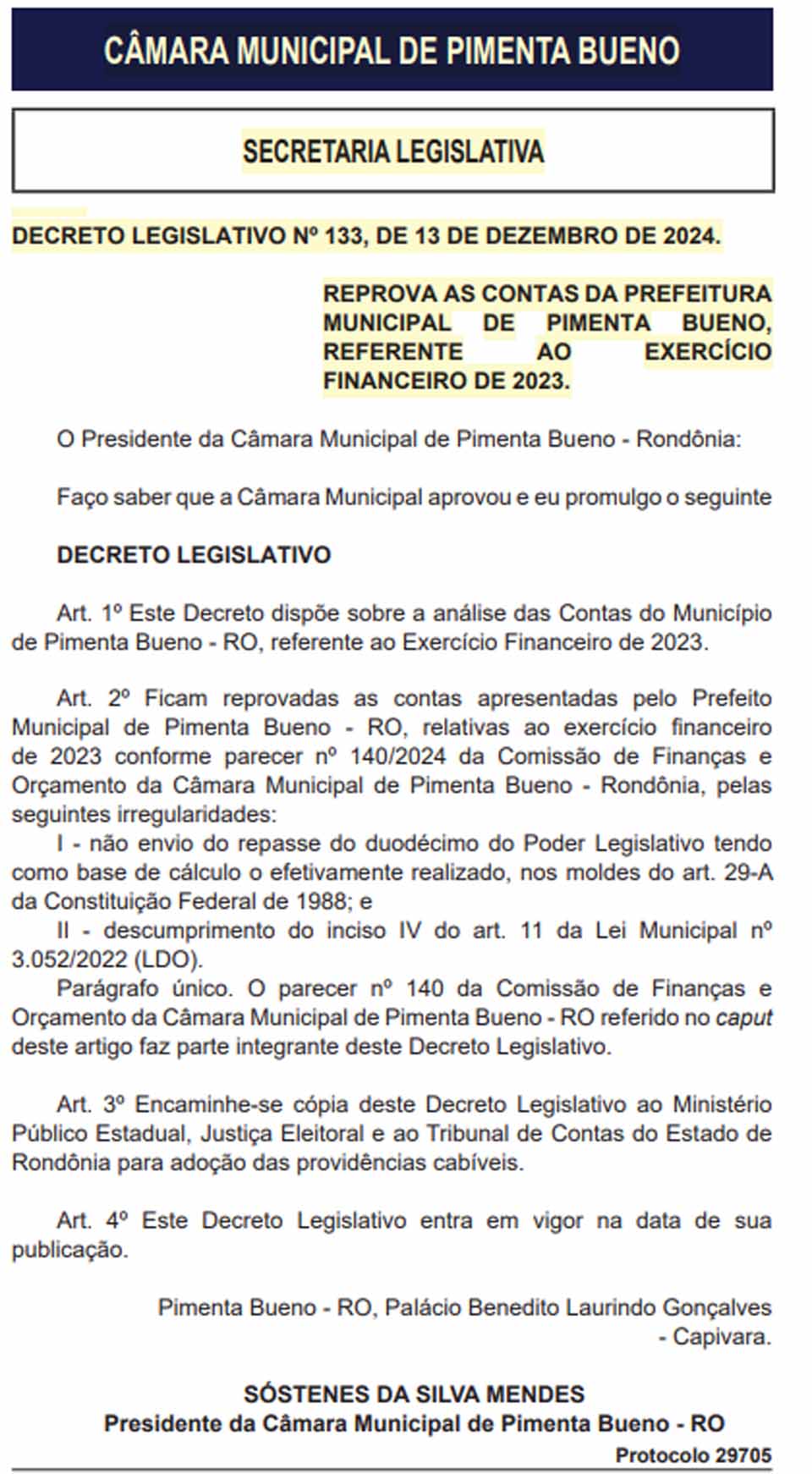A Câmara Municipal, após análise técnica do balanço anual, deliberou pela rejeição das contas do exercício de 2023. O Decreto Legislativo nº 133/2024 formalizou a decisão e determinou o encaminhamento da matéria ao Ministério Público Estadual, à Justiça Eleitoral e ao Tribunal de Contas do Estado de Rondônia para adoção das medidas cabíveis. O documento listou expressamente as irregularidades: “não envio do repasse do duodécimo do Poder Legislativo tendo como base de cálculo o efetivamente realizado, nos moldes do art. 29-A da Constituição Federal, e descumprimento do inciso IV do art. 11 da Lei Municipal nº 3.052/2022 (LDO)”.
