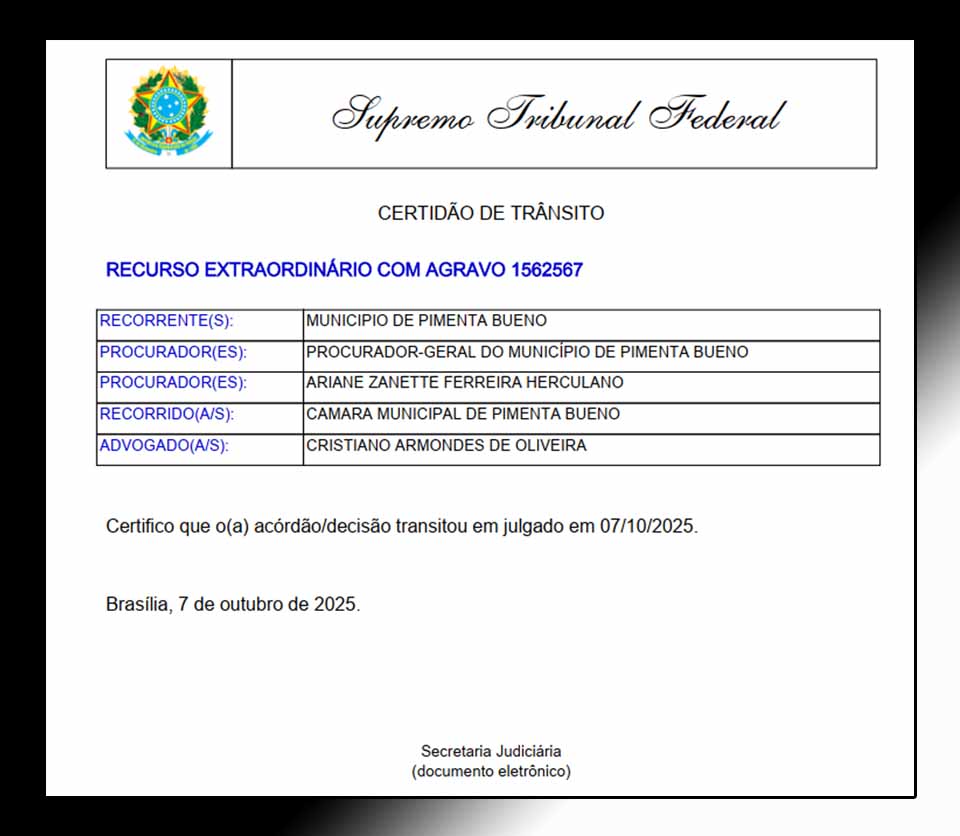 O recurso, contudo, foi negado pelo ministro André Mendonça. O Supremo considerou o pedido inadmissível por ausência de repercussão geral, mantendo a decisão do TJ-RO. A certidão de trânsito em julgado emitida pelo STF confirma que o processo tornou-se definitivo em 7 de outubro de 2025, e o Tribunal de Justiça de Rondônia registrou a baixa definitiva três dias depois, encerrando o litígio.