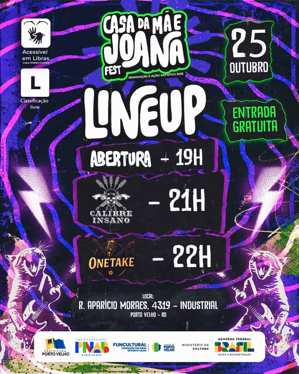 Porto Velho, RO – O evento “Casa da Mãe Joana Fest – Renovação e Ação Artística 2025” será realizado neste sábado, dia 25 de outubro, às 19h, no espaço cultural Casa da Mãe Joana, em Porto Velho (RO). Com entrada gratuita e acessibilidade em Libras, o festival apresentará shows das bandas Calibre Insano e Onetake, valorizando o rock autoral e a produção musical independente da capital rondoniense.