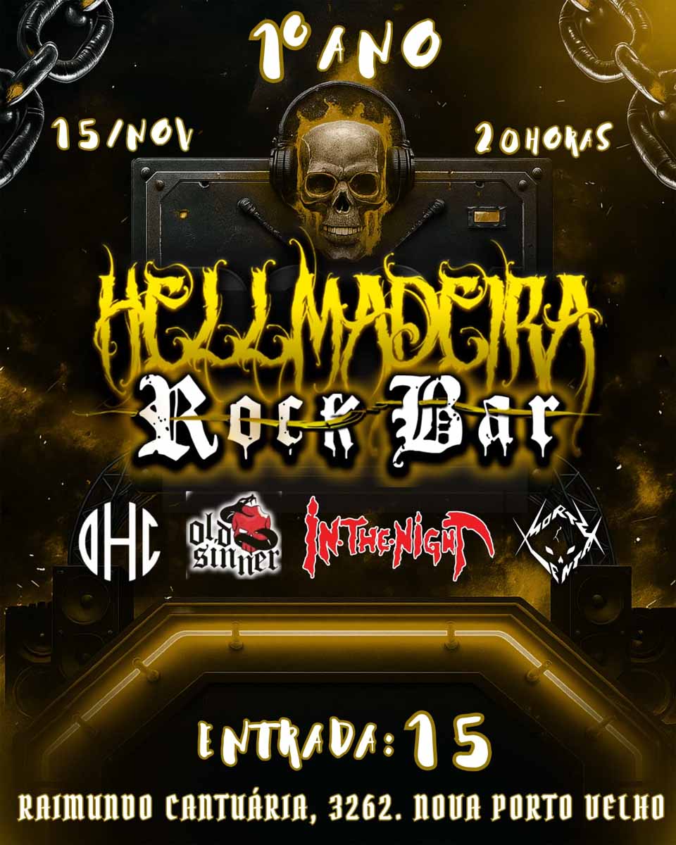 Porto Velho, RO – O Hellmadeira Rock Bar, espaço dedicado à cena underground de Porto Velho, completa seu primeiro aniversário com uma programação especial no dia 15 de novembro. A celebração, marcada para as 20h, contará com apresentações das bandas D.H.C, Old Sinner, In The Night e Morte Lenta, reunindo estilos que vão do hardcore ao heavy metal.