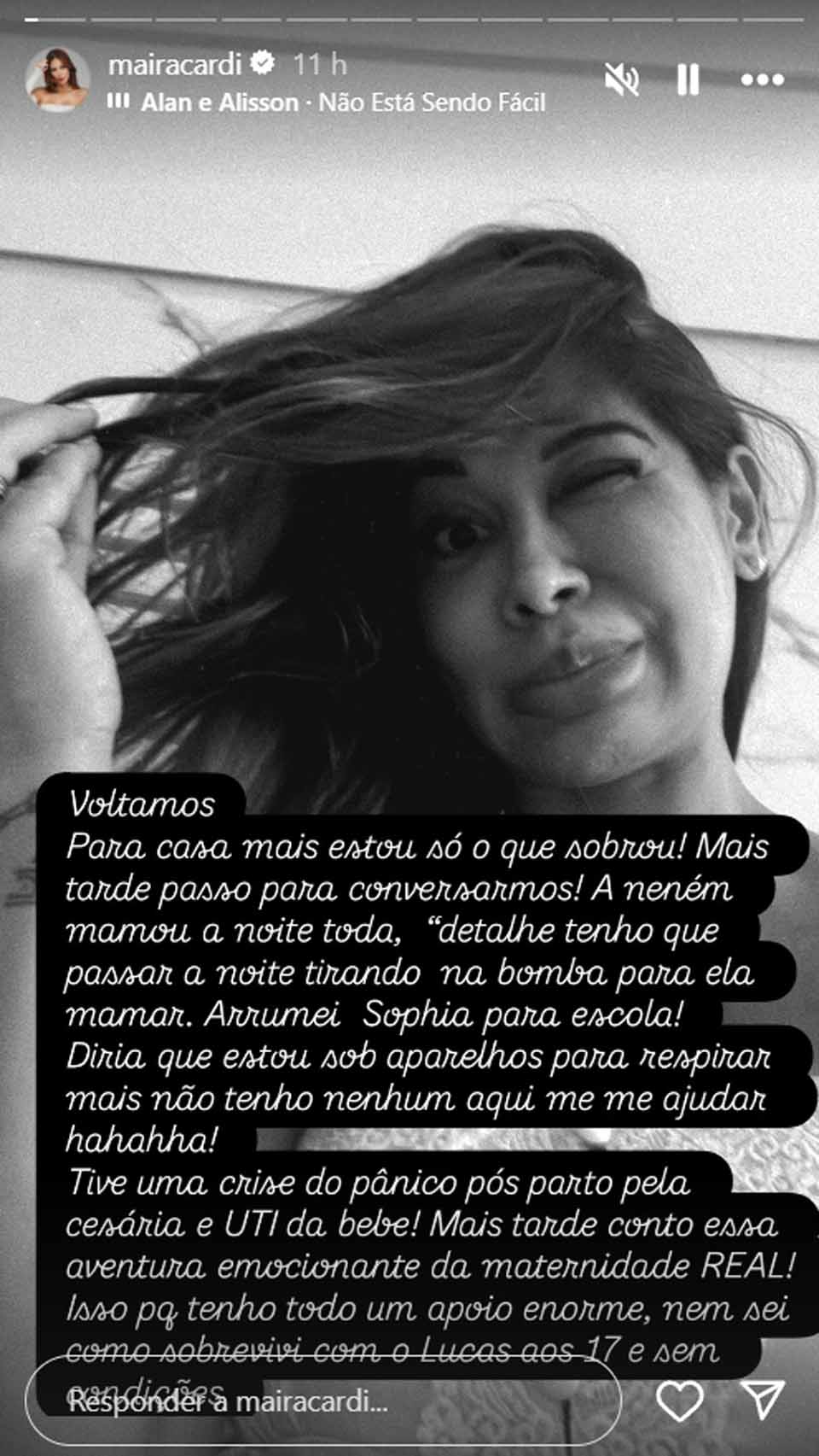 Pelo Instagram, Maíra relatou que enfrentou uma crise de pânico no período de internação e durante o processo de recuperação. “Voltamos para casa, mas estou só o que sobrou. A neném mamou a noite toda, detalhe: tenho que passar a noite tirando na bomba para ela mamar. Arrumei Sophia para a escola. Diria que estou sob aparelhos para respirar, mas não tenho nenhum aqui me ajudar”, escreveu.