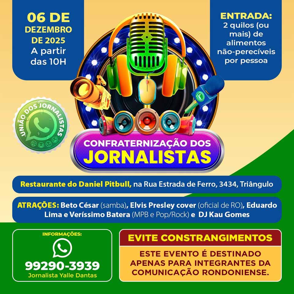 Porto Velho, RO – Marcada para o dia 6 de dezembro de 2025, a tradicional Festa dos Jornalistas de Rondônia chega à sua 13ª edição reunindo profissionais da comunicação de todo o Estado em um evento exclusivo. A confraternização acontecerá das 10h às 18h, no Restaurante Pitbull, localizado na Rua da Estrada de Ferro, 3434, bairro Triângulo, em Porto Velho.