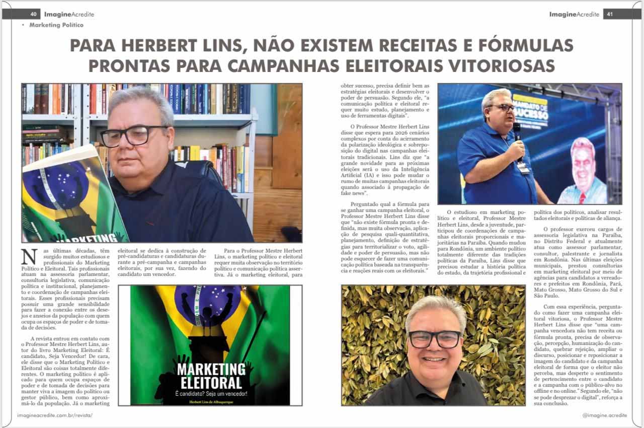 Porto Velho, RO – O colunista Herbert Lins, especialista em marketing político e titular da Coluna Falando Sério, foi tema de uma reportagem da revista Imagine/Acredite, publicação impressa de alta circulação nos corredores dos Três Poderes, em Brasília. A matéria apresenta a trajetória acadêmica e profissional do professor, sua visão sobre disputas eleitorais e sua atuação em campanhas e consultorias em diferentes estados brasileiros.