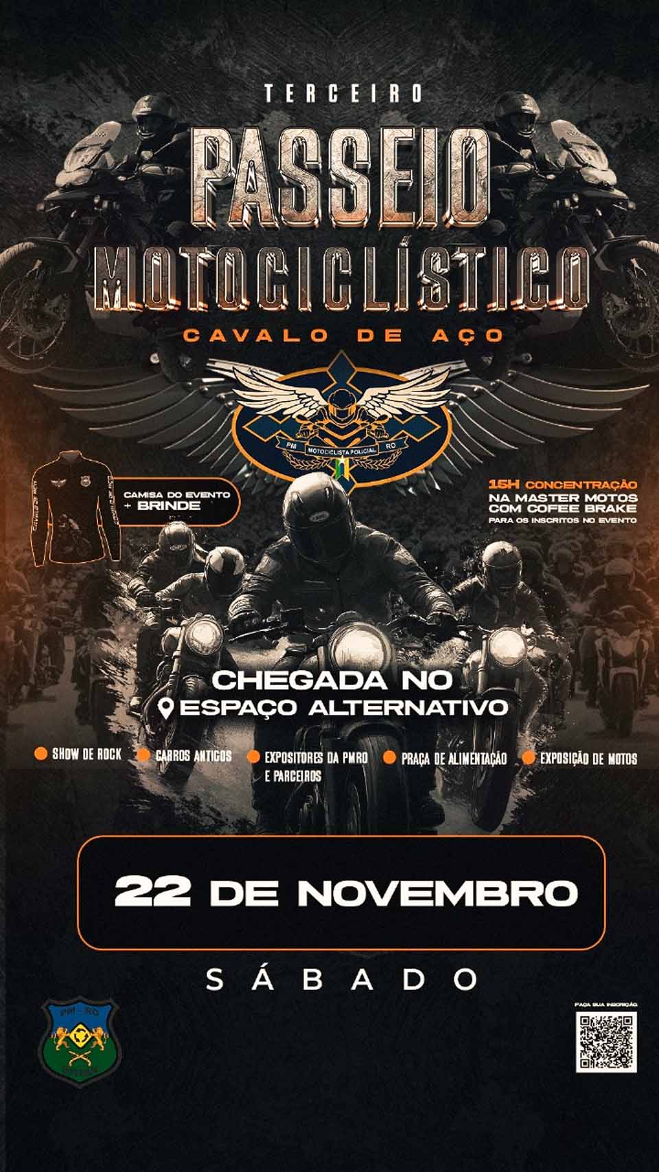 Porto Velho, RO – O 3º Passeio Motociclístico Cavalo de Aço será realizado no próximo sábado, 22 de novembro, organizado pela coordenação do Curso de Motociclista Policial da Polícia Militar de Rondônia. A atividade é aberta ao público e permite a participação tanto de quem possui motocicleta quanto de quem deseja acompanhar apenas a programação no local de chegada.