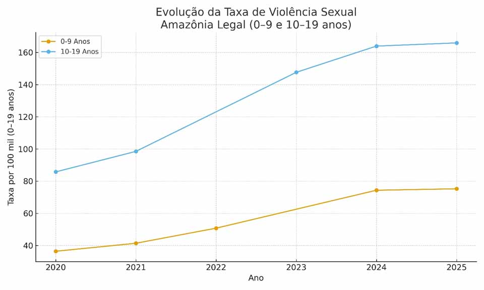 Porto Velho, RO – A Amazônia Legal vive um cenário de agravamento acelerado da violência sexual contra crianças e adolescentes, revelado por análises baseadas em bancos de dados do Ministério da Saúde e do Instituto Brasileiro de Geografia e Estatística. Entre 2020 e 2024, as notificações mais que dobraram em todos os nove estados da região, configurando uma crise que se intensifica ano a ano. As taxas de violência sexual registradas contra adolescentes de 10 a 19 anos passaram de 85,76 para 163,94 casos por 100 mil habitantes, enquanto, entre crianças de 0 a 9 anos, o aumento foi ainda mais expressivo, de 36,42 para 74,35, representando crescimento superior a 104%.