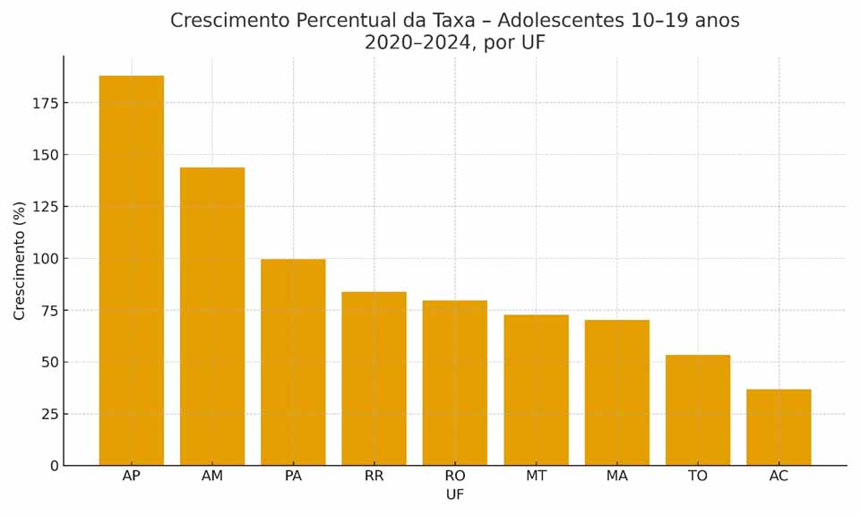 A região registra dois movimentos distintos. O primeiro envolve estados onde as taxas cresceram de forma explosiva. O Amapá apresentou a maior escalada percentual da Amazônia Legal, com aumento de 188% nos registros entre adolescentes. O Amazonas também registrou crescimento superior a 140% tanto na primeira infância quanto nos anos da adolescência, indicando que o problema avança rapidamente em contextos onde a rede de proteção já enfrentava limitações anteriores.