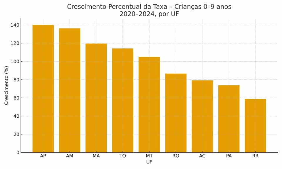 O segundo movimento envolve estados que concentram os números mais expressivos em termos absolutos. O Tocantins lidera as taxas para crianças entre 0 e 9 anos, com 350,22 casos por 100 mil habitantes em 2024, além de registrar 333,51 casos por 100 mil adolescentes. Roraima, por sua vez, alcançou 290,92 por 100 mil adolescentes, consolidando um dos cenários mais graves da região. Esses indicadores mostram que, em determinadas áreas, a violência sexual atingiu patamares compatíveis com emergências de saúde pública e de segurança.