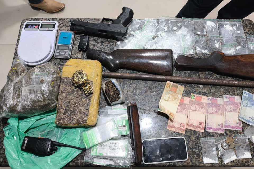 No imóvel, os policiais abordaram um casal. Durante a revista, foram encontradas pequenas porções de cocaína. As buscas pelo terreno continuaram e, em um buraco próximo a um chiqueiro, os militares localizaram uma bolsa contendo quantidade expressiva de entorpecentes, embalagens usadas para comercialização, duas balanças de precisão e partes de armas de fogo.
