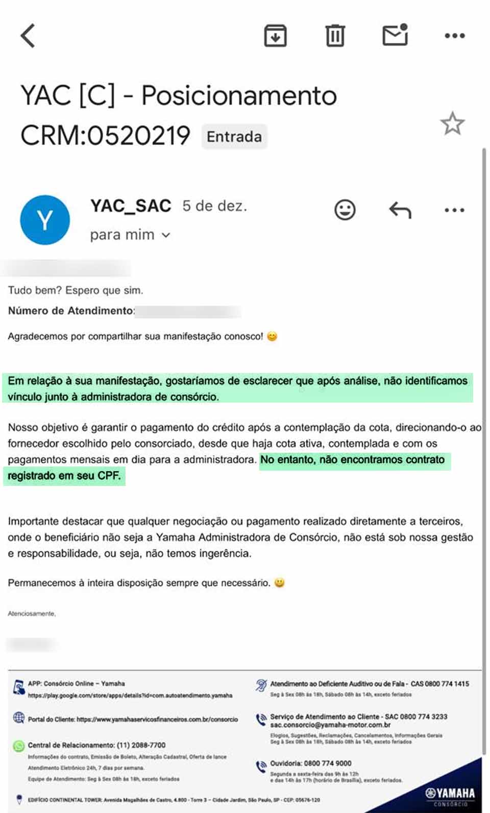 A fraude foi definitivamente exposta quando a vítima entrou em contato direto com a Yamaha Motor, administradora citada nos documentos apresentados. A empresa confirmou que não havia qualquer vínculo com o vendedor ou com a suposta empresa intermediadora. A carta contemplada não existia nos registros oficiais.
