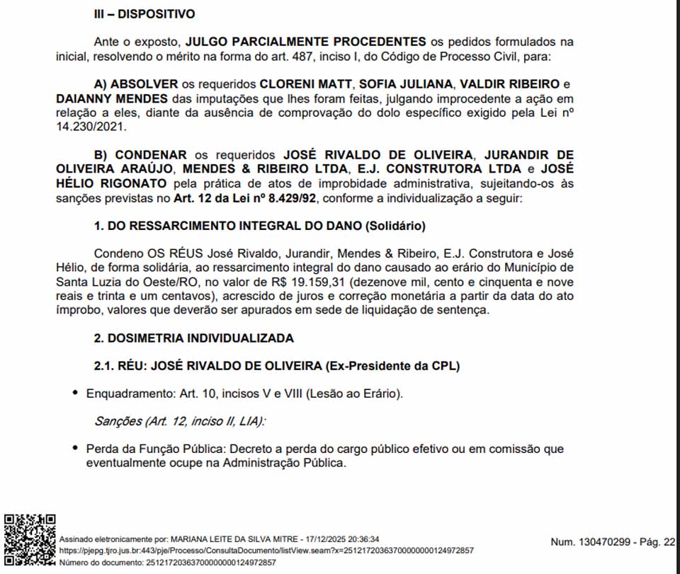 A decisão foi assinada eletronicamente em 17 de dezembro de 2025, às 20h36, pela juíza Mariana Leite da Silva Mitre, no âmbito da Ação Civil de Improbidade Administrativa nº 7002326-72.2017.8.22.0018, ajuizada pelo Ministério Público de Rondônia. No dispositivo, a magistrada julgou a ação parcialmente procedente, afastando a responsabilidade de alguns réus por falta de comprovação de dolo específico, exigência introduzida pela Lei nº 14.230/2021, e reconhecendo a prática de atos ímprobos por outros envolvidos no procedimento licitatório.
