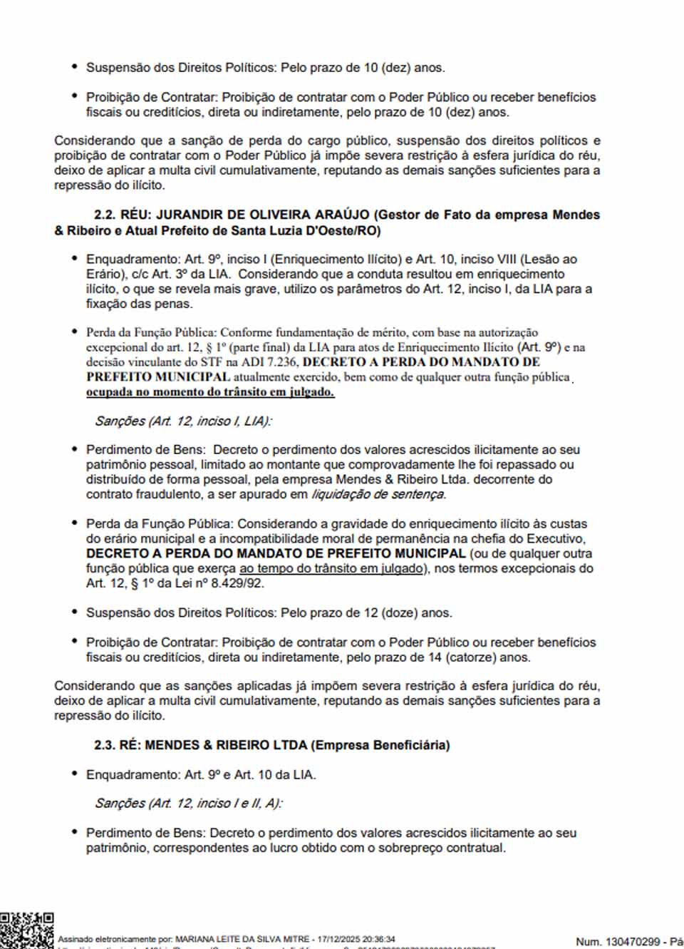 Ao final, a sentença consignou que a execução das sanções de perda de função pública e suspensão dos direitos políticos somente ocorrerá após o trânsito em julgado. Após essa fase, deverão ser comunicadas a Justiça Eleitoral e a Câmara Municipal de Santa Luzia do Oeste para as providências legais, incluindo a declaração de vacância do cargo de prefeito, bem como a inclusão dos condenados nos cadastros CEIS e CNIA.