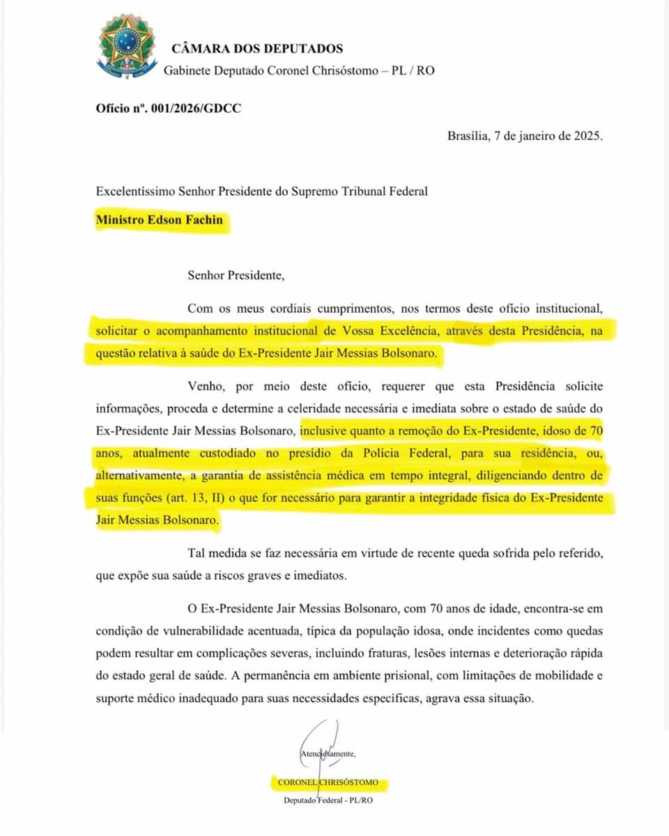 O ofício é subscrito por Coronel Chrisóstomo na condição de deputado federal pelo PL de Rondônia e conclui com a solicitação de que sejam adotadas as providências necessárias para garantir a integridade física e o acompanhamento adequado da saúde do ex-presidente Jair Messias Bolsonaro.