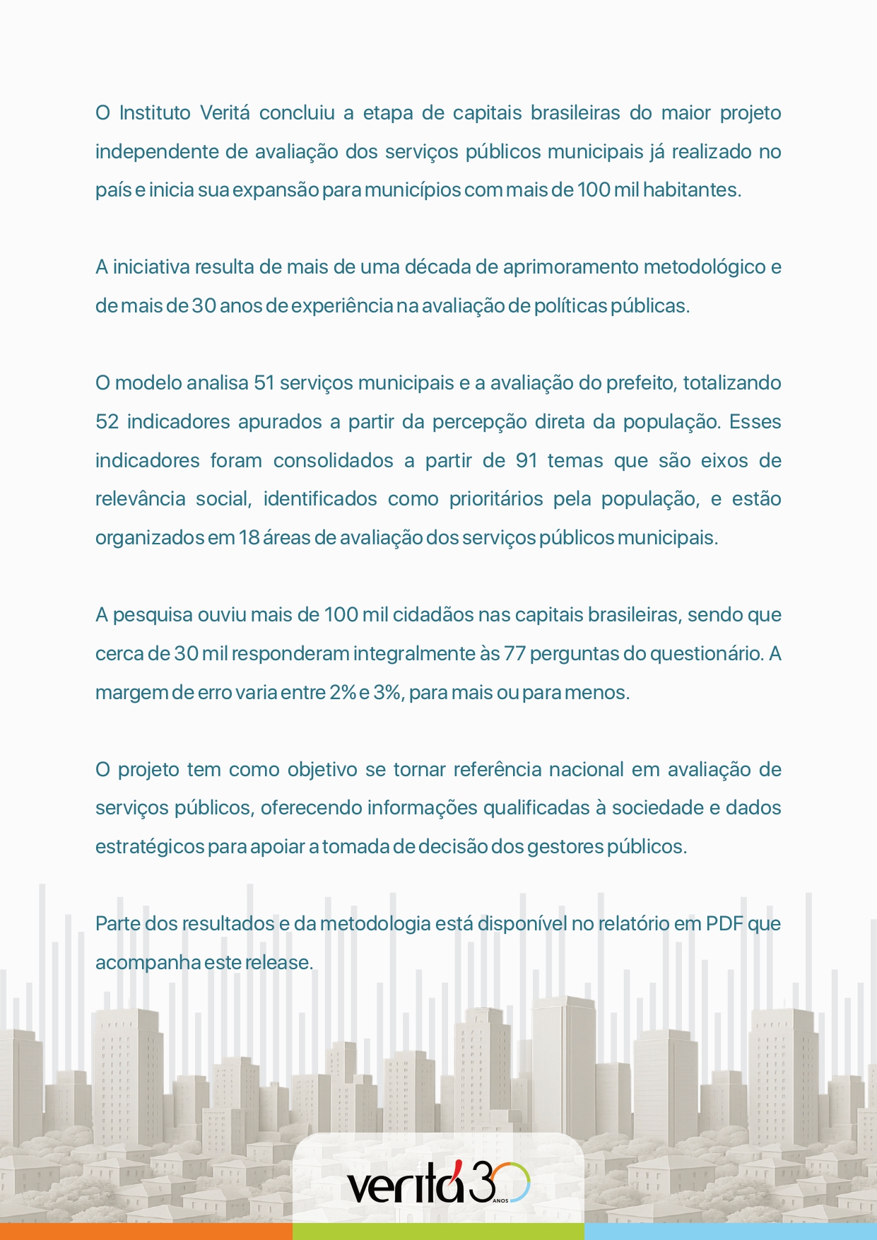 Segundo o Instituto Veritá, o projeto tem como objetivo oferecer dados qualificados à sociedade e subsídios técnicos para apoiar decisões na gestão pública municipal, com base na percepção direta dos cidadãos entrevistados nas capitais brasileiras.
