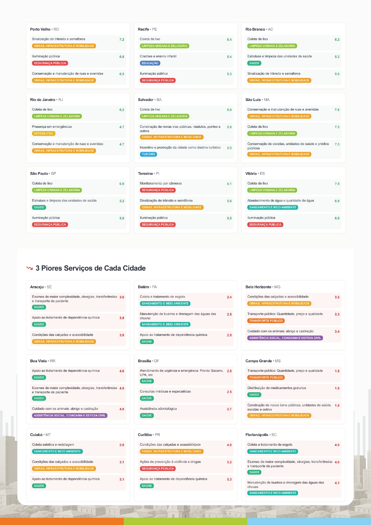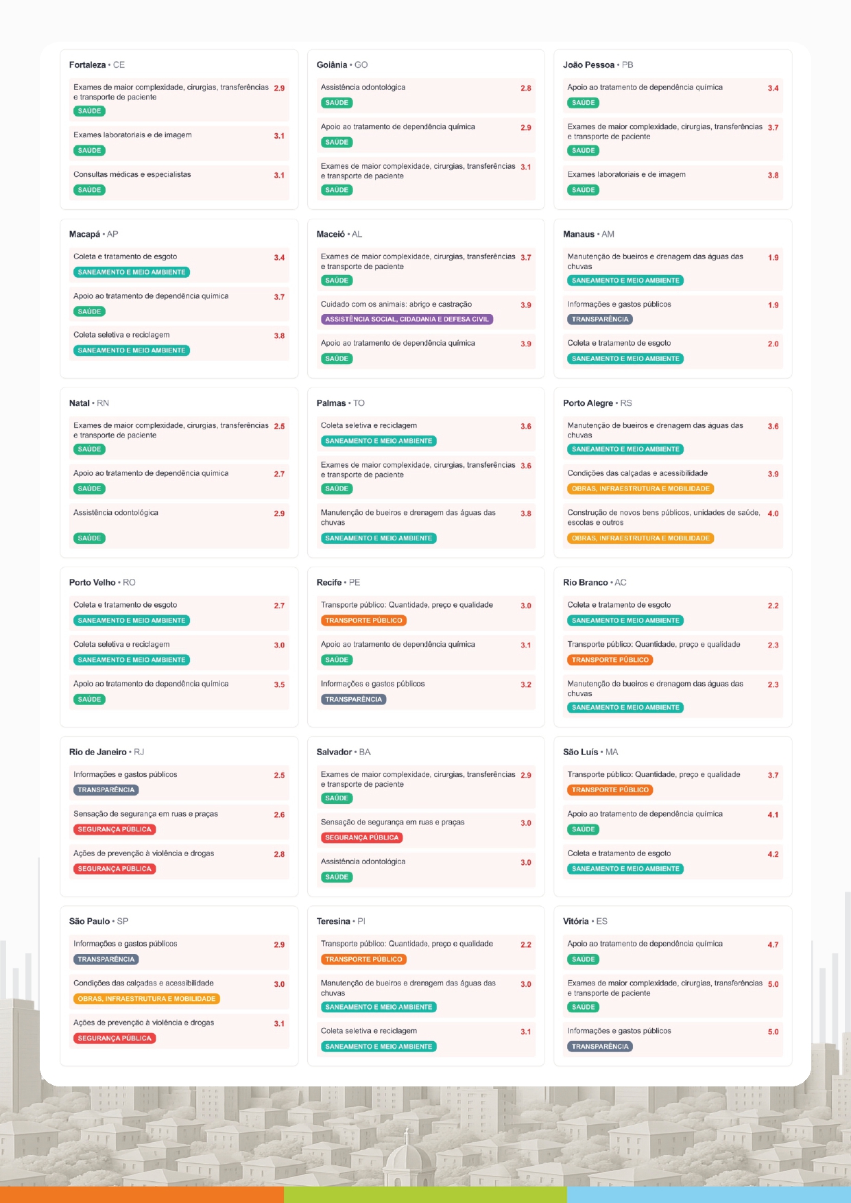 No panorama agregado das capitais, os serviços com melhores médias gerais incluem coleta de lixo, iluminação pública, sinalização de trânsito e semáforos e merenda escolar. Já entre os serviços apontados como os que demandam maior atenção aparecem o apoio ao tratamento de dependência química, exames de maior complexidade, cirurgias, transferências e transporte de pacientes, além de informações e gastos públicos.