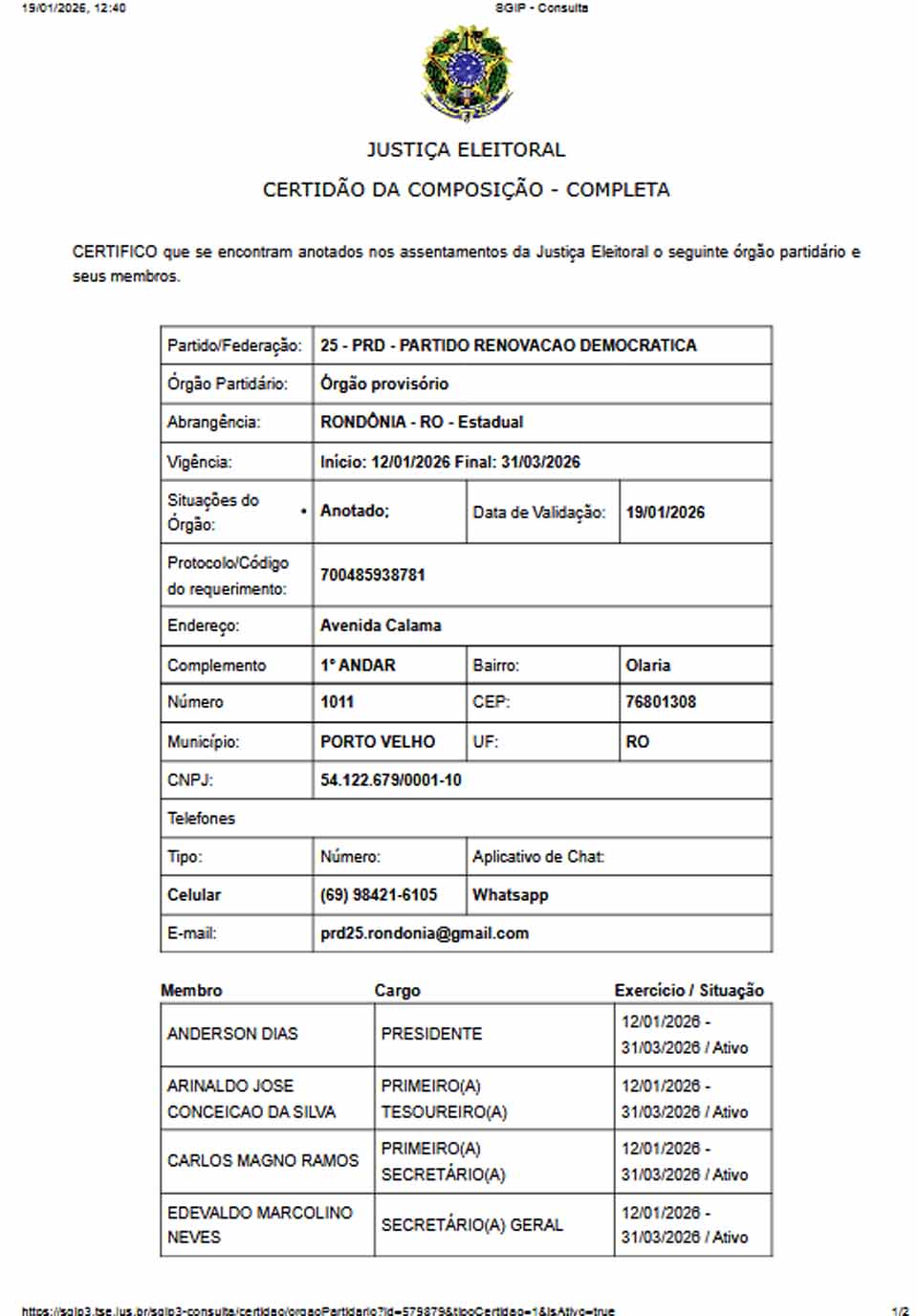 Porto Velho, RO – A Justiça Eleitoral certificou, nesta segunda-feira, 19 de janeiro de 2026, a composição completa do órgão partidário provisório do Partido Renovação Democrática (PRD) em Rondônia.