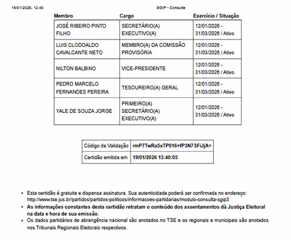 A certidão, emitida pelo Sistema de Gerenciamento de Informações Partidárias (SGIP), confirma a anotação da nova direção estadual da legenda, com vigência entre 12 de janeiro e 31 de março de 2026, abrangência estadual e sede em Porto Velho.