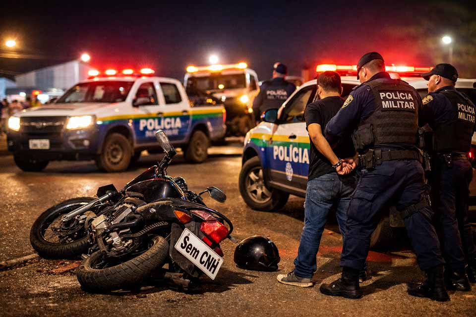 A atuação ocorreu durante fiscalização de trânsito realizada pela Polícia Militar de Rondônia em área com grande circulação de pessoas, nas proximidades do Ginásio Capitão Rui Luz Teixeira, onde acontecia um evento esportivo. No local, a guarnição identificou uma motocicleta executando manobra perigosa conhecida como “empinar”, expondo pedestres e outros motoristas a risco imediato.