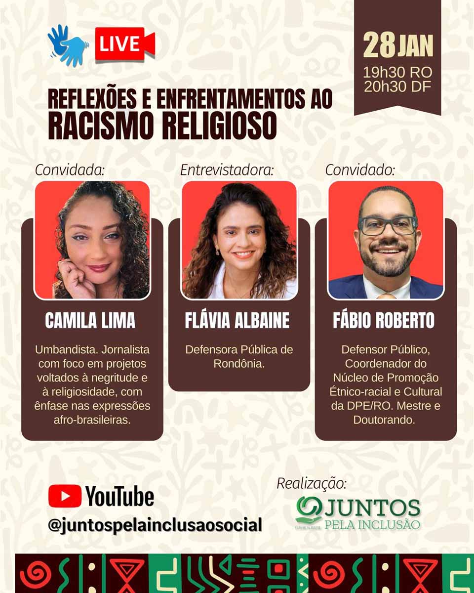 A mediação ficará sob responsabilidade de Flávia Albaine, defensora pública de Rondônia. Participam do debate Camila Lima, jornalista e umbandista, autora da coluna Entre Linhas e Margens, dedicada ao resgate da memória da cidade a partir das trajetórias de negros, nordestinos, indígenas, mulheres e grupos religiosos marginalizados, e Fábio Roberto, defensor público, coordenador do Núcleo de Promoção Étnico-Racial e Cultura da DPE/RO, mestre e doutorando.