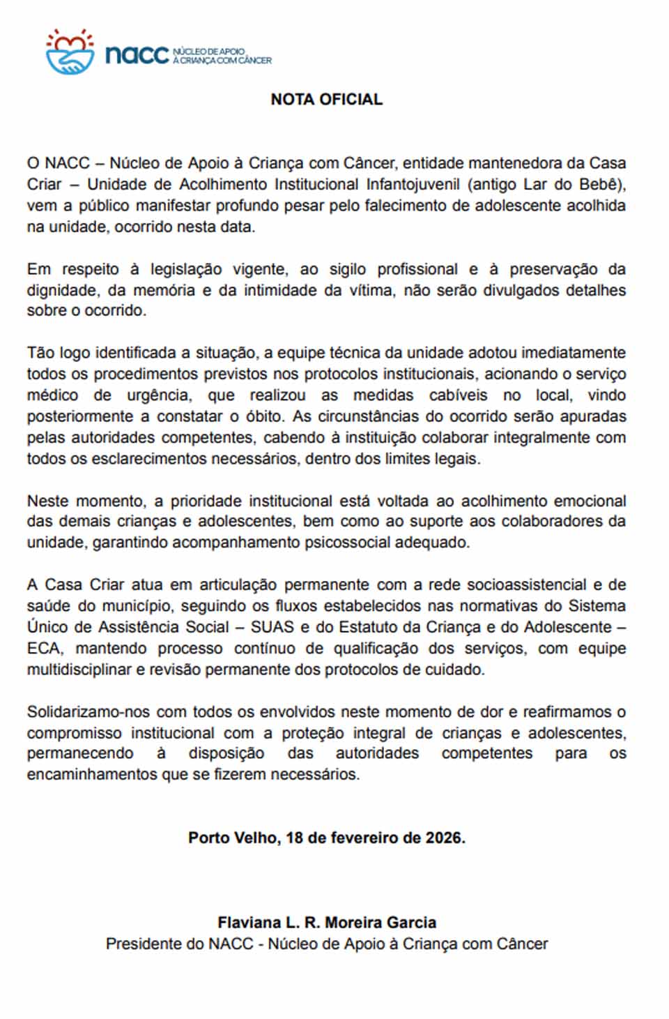 Porto Velho, RO – NACC divulga nota oficial sobre morte de adolescente acolhida na Casa Criar em Porto Velho