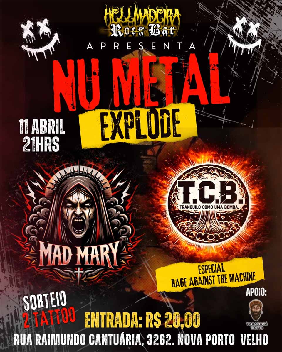 Porto Velho, RO – O HellMadeira Rock Bar anunciou a realização do evento “Nu Metal Explode”, programado para o dia 11 de abril, às 21 horas, em Porto Velho. A apresentação ocorrerá no endereço Rua Raimundo Cantuária, nº 3262, no bairro Nova Porto Velho.
