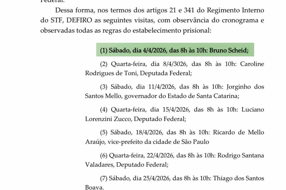 O encontro entre Scheid e Bolsonaro foi agendado para o dia 4 de abril de 2026, no período entre 8h e 10h da manhã, nas dependências do 19º Batalhão da Polícia Militar do Distrito Federal, unidade instalada dentro do Complexo Penitenciário da Papuda e responsável pela custódia do ex-presidente. No caso do pecuarista rondoniense, o pedido de visita foi apresentado pelo próprio Bolsonaro.