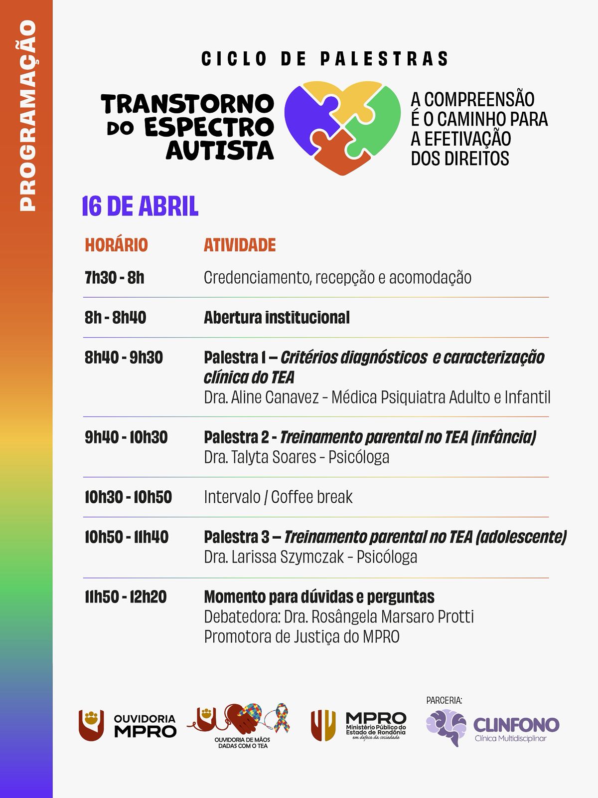 A programação do primeiro dia, 16 de abril, terá início às 7h30 com credenciamento, recepção e acomodação dos participantes. Às 8h ocorre a abertura institucional. Na sequência, às 8h40, será realizada a palestra “Critérios diagnósticos e caracterização clínica do TEA”, ministrada pela médica psiquiatra da infância e adolescência Dra. Aline Elen Martins Canavez, profissional vinculada ao CER IV – DREAM/HA. Às 9h40, a psicóloga Talyta Soares conduzirá a palestra “Treinamento parental no TEA (infância)”. Após intervalo para coffee break, às 10h50, a psicóloga e analista do comportamento Dra. Larissa Szymczak Vieira ministrará a palestra “Treinamento parental no TEA (adolescente)”. O encerramento das atividades do dia ocorrerá com momento para dúvidas e perguntas, tendo como debatedora a Promotora de Justiça Dra. Rosângela Marsaro Protti.