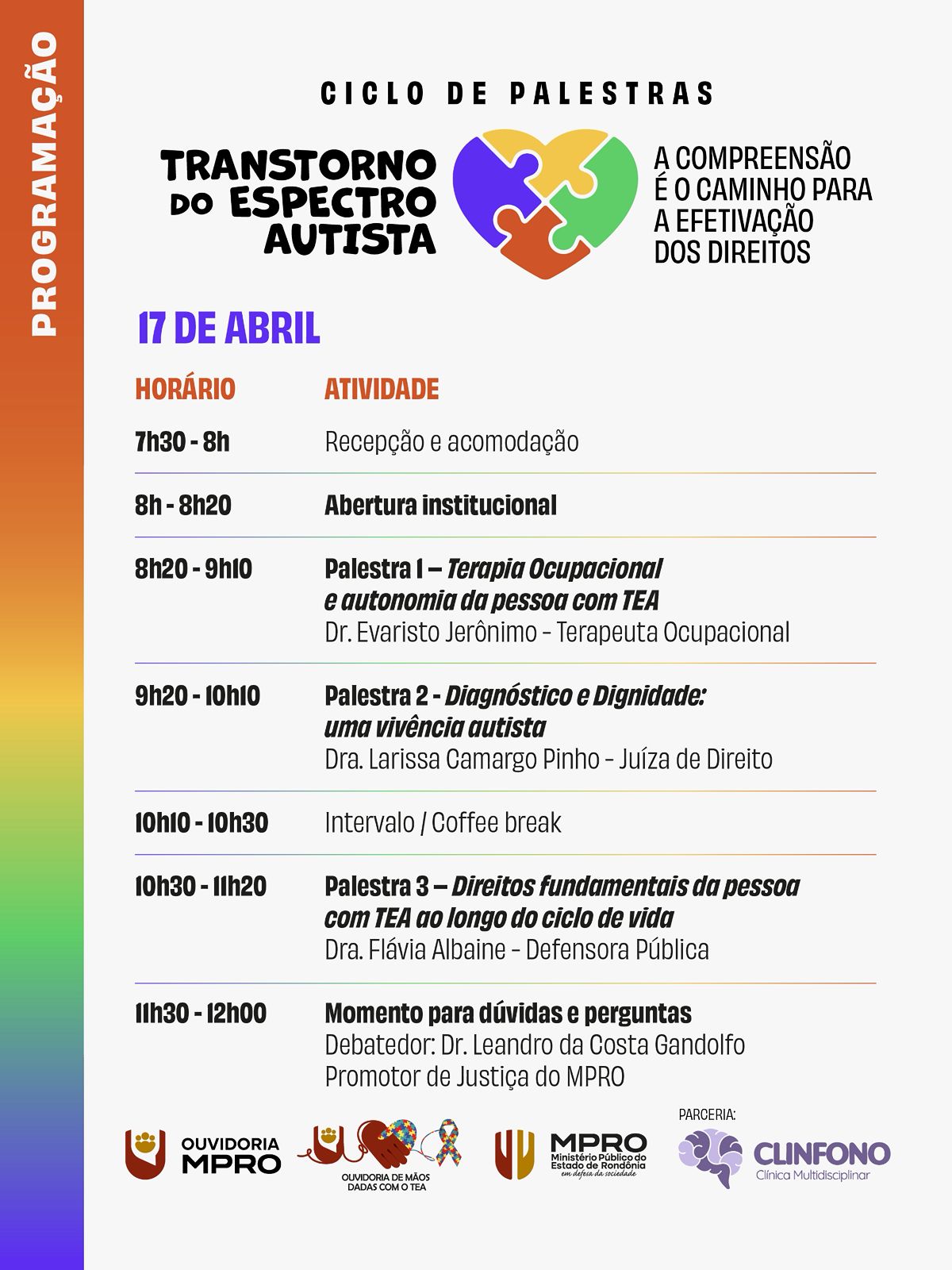 No segundo dia, 17 de abril, a programação será retomada às 7h30 com recepção e acomodação. Às 8h20 será realizada nova abertura institucional. Em seguida, às 8h20, o terapeuta ocupacional Dr. Evaristo Jerônimo Silva apresentará a palestra “Terapia Ocupacional e autonomia da pessoa com TEA”. Às 9h20, a Juíza de Direito Dra. Larissa Camargo Pinho ministrará a palestra “Diagnóstico e Dignidade: uma vivência autista”. Após o intervalo, às 10h30, a Defensora Pública Dra. Flávia Albaine apresentará a palestra “Direitos fundamentais da pessoa com TEA ao longo do ciclo de vida”. O encerramento será novamente destinado a perguntas do público, com participação do Promotor de Justiça Dr. Leandro da Costa Gandolfo como debatedor.