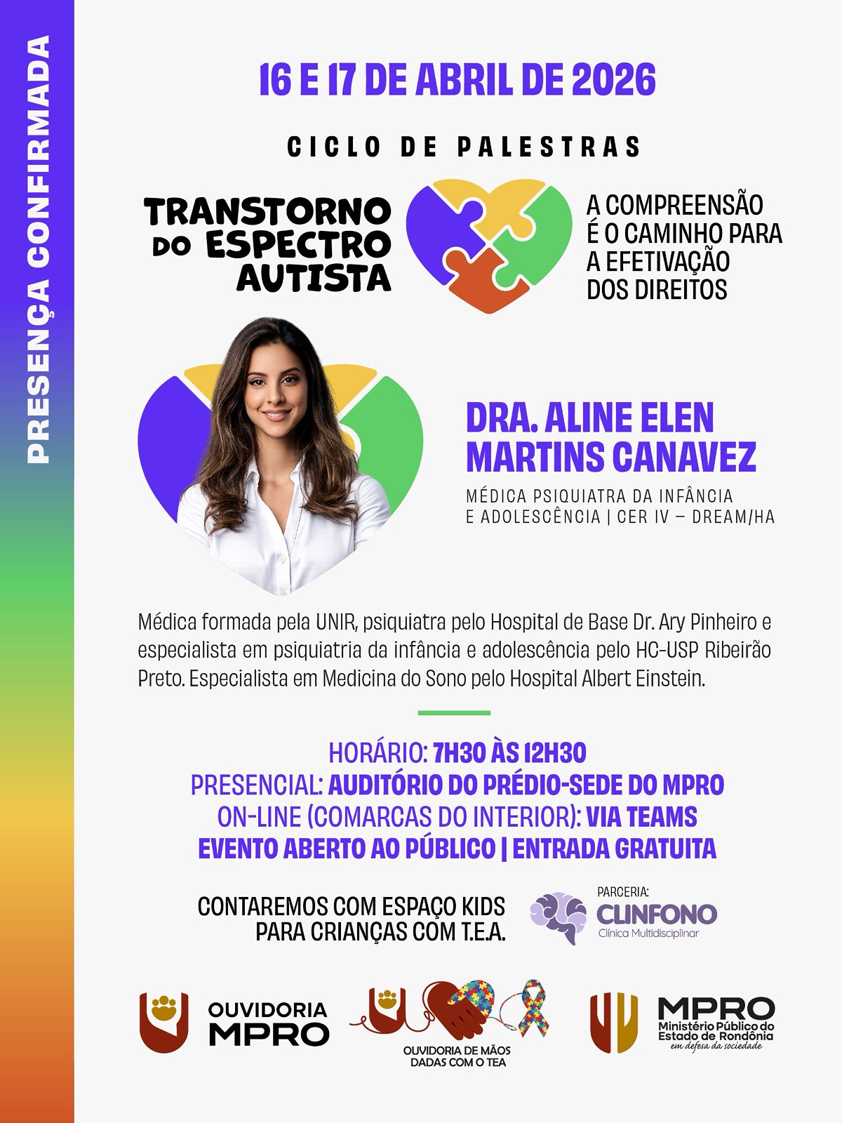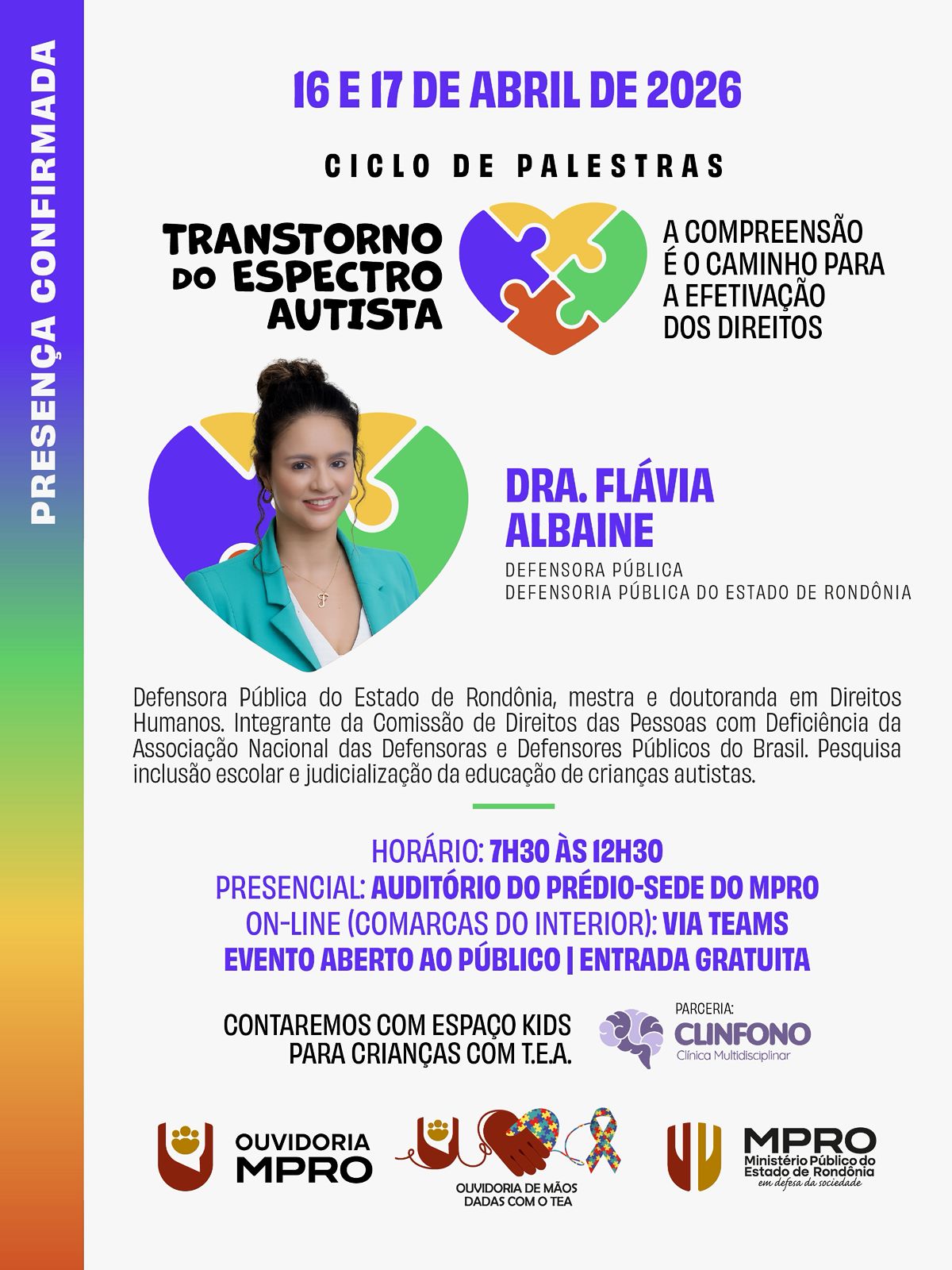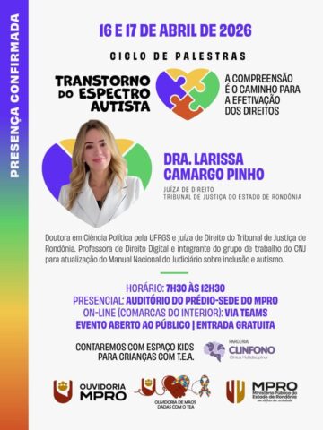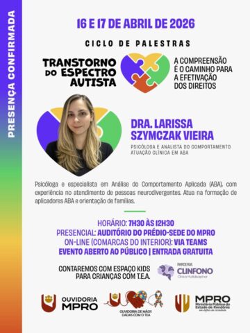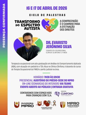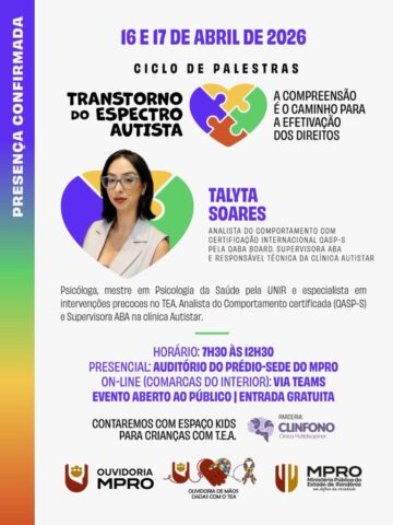 Porto Velho, RO – O Ministério Público do Estado de Rondônia, por meio de sua Ouvidoria, realiza nos dias 16 e 17 de abril de 2026 o ciclo de palestras “Transtorno do Espectro Autista: a compreensão é o caminho para a efetivação dos direitos”, iniciativa voltada à promoção de conhecimento técnico, clínico e jurídico sobre o TEA. As inscrições podem ser feitas até esta terça-feira, 14 de abril, por meio da plataforma oficial do órgão.