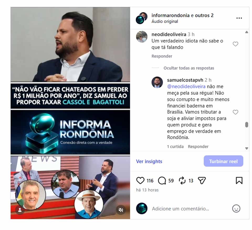 Nos comentários da publicação, Neodi Carlos de Oliveira escreveu: “Um verdadeiro idiota não sabe o que tá falando”. Em resposta direta, Samuel Costa publicou a seguinte mensagem: “@neodideoliveira não me meça pela sua régua! Não sou corrupto e muito menos financiei baderna em Brasília. Vamos tributar a soja e aliviar impostos para quem produz e gera emprego de verdade em Rondônia.”