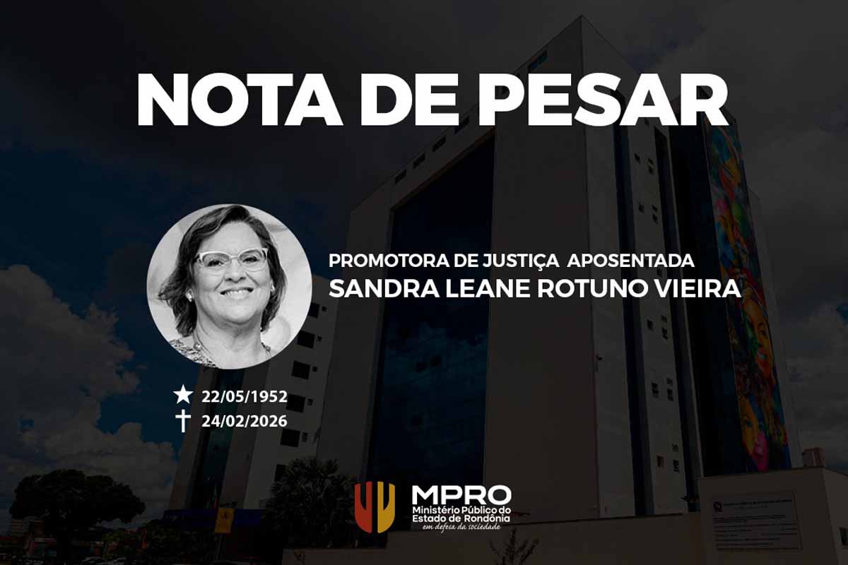 Por Yan Simon - quarta-feira, 25/02/2026 - 10h09Porto Velho, RO – O sepultamento da Promotora de Justiça aposentada Sandra Leane Rotuno Vieira está marcado para as 16h desta quarta-feira (25/2), no Cemitério Recanto da Paz, em Porto Velho. O velório é realizado na Funerária São Cristóvão – Capela Três Marias. O falecimento foi registrado nesta […]