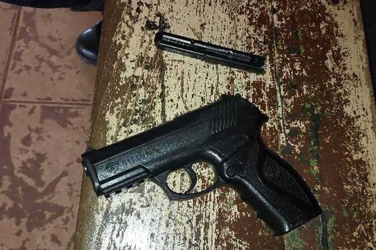 Suspeitos foram flagrados pelo 6º BPM enquanto agrediam vítima caída ao solo; simulacro de arma de fogo e porções de substância semelhante à cocaína foram apreendidos